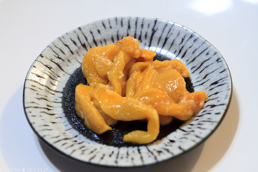 海鞘肉的肌肉紋理很分明. 不過切成一片片很難想像原來那個グロ得很的外觀.